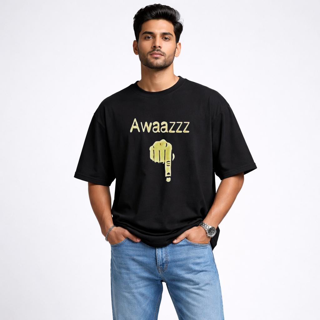 Elevate your streetwear game with the trendy black oversized t-shirt that speaks volumes about your personality. Featuring a bold “Awaazzz” graphic design with a striking and unique hand pattern, this t-shirt is the ultimate statement piece for fashion-forward individuals looking for all-day comfort and versatility. Designed to easily pair with your favorite jeans, joggers, or shorts, this t-shirt is all you need to seamlessly achieve a cool, laid-back look without compromising on style.