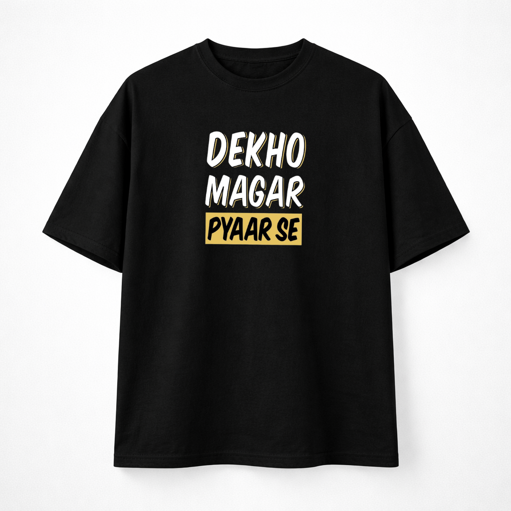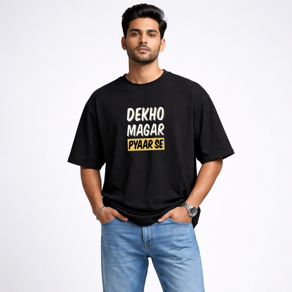 Whether you’re heading out for a chill day with friends or hitting the streets to show off your unique vibe, this t-shirt complements any urban outfit. The “Dekho Magar Pyaar Se” print draws attention, sparking intrigue and admiration wherever you go. Its bold design makes it more than just apparel—it’s an extension of your personality and attitude. Perfect for expressing individuality, this oversized tee is a standout piece in any fashion collection.